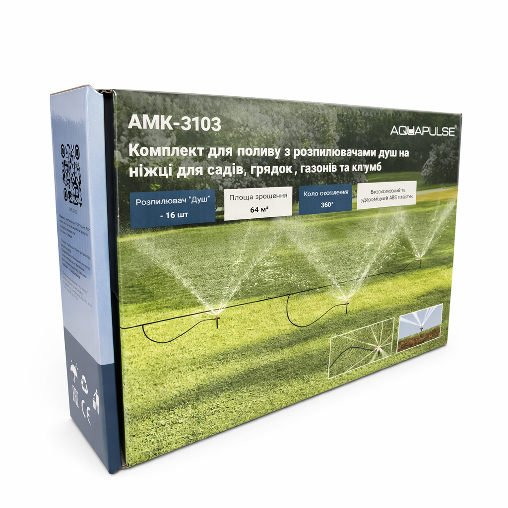 Якщо вам потрібен готовий набір із розпилювачами «Душ» для рівномірного поливу ділянок до 64 м², комплект АМК-3103 стане практичним рішенням. Він поєднує базові елементи підключення, розподілу води та зрошення в одному наборі, що дозволяє швидко організувати ефективний полив для саду, грядок, клумб і газону.